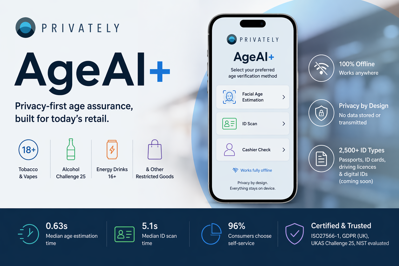 Unlike other solutions, Privately’s age verification happens entirely on the device (smartphone, tablet or PC).